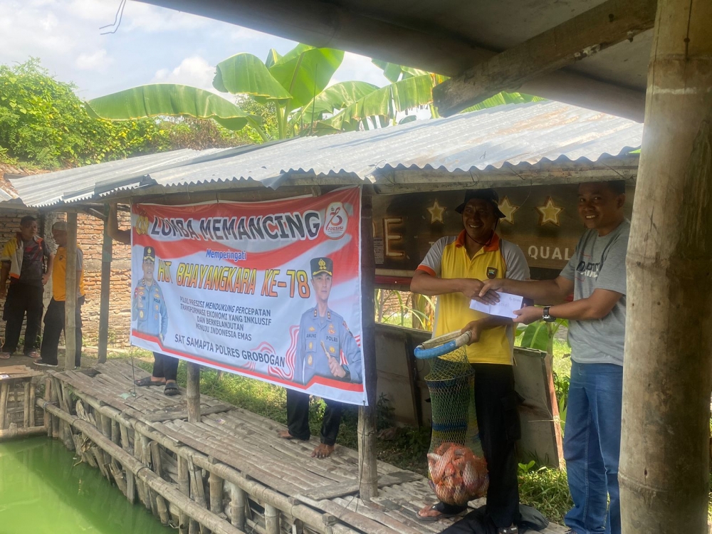 Polres Grobogan - Polda Jateng - Dalam rangka menyambut Hari Bhayangkara ke-78, Sat Samapta Polres Grobogan menggelar lomba memancing di kolam pemancingan Mbah Bon, Purwodadi, Grobogan.