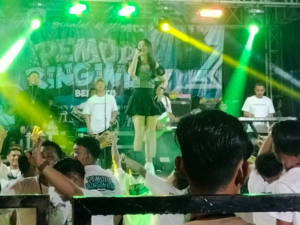 Pentas musik dangdut tersebut menjadi hiburan bagi masyarakat setempat dan dihadiri oleh ratusan penonton yang antusias menikmati acara.