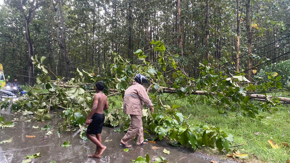 Proses evakuasi pun dilakukan dengan cepat. Bripka Suharno bersama seorang warga memotong batang dan ranting kayu menggunakan sabit dan menyingkirkannya dari jalan raya.