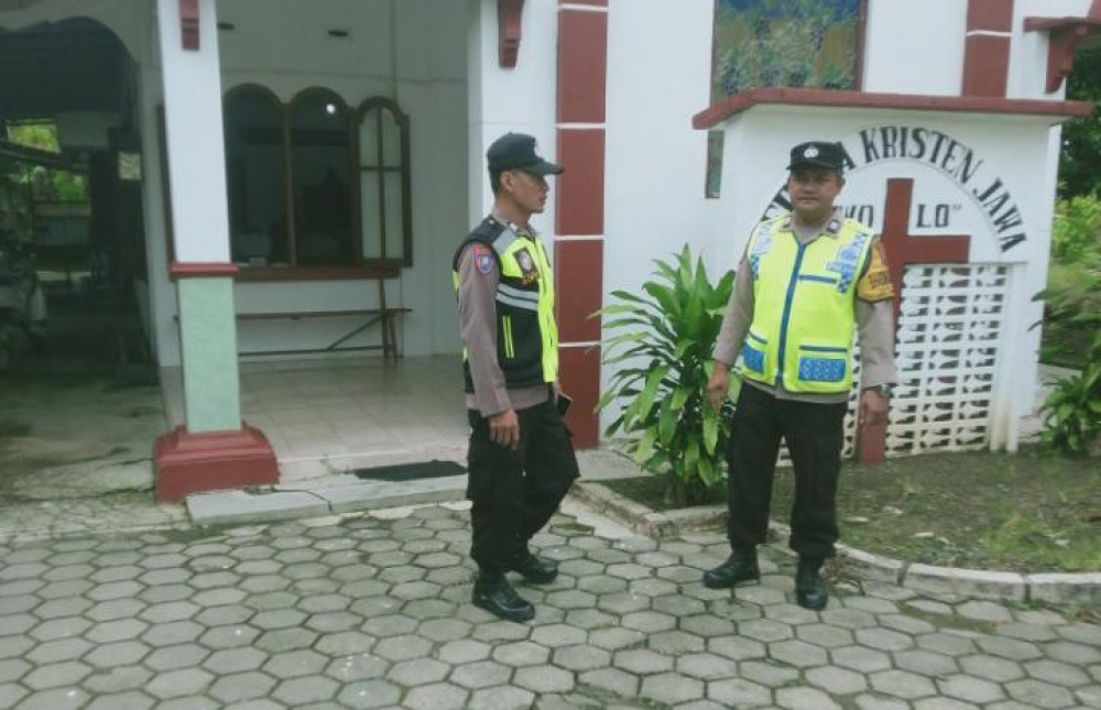 Polres Grobogan - Polda Jateng - Polsek Penawangan melaksanakan kegiatan pengamanan ibadah Minggu di Gereja Kristen Jawa (GKJ) Desa Wolo, Kabupaten Grobogan, pada Minggu (19/4/2026).